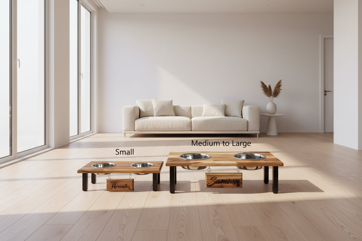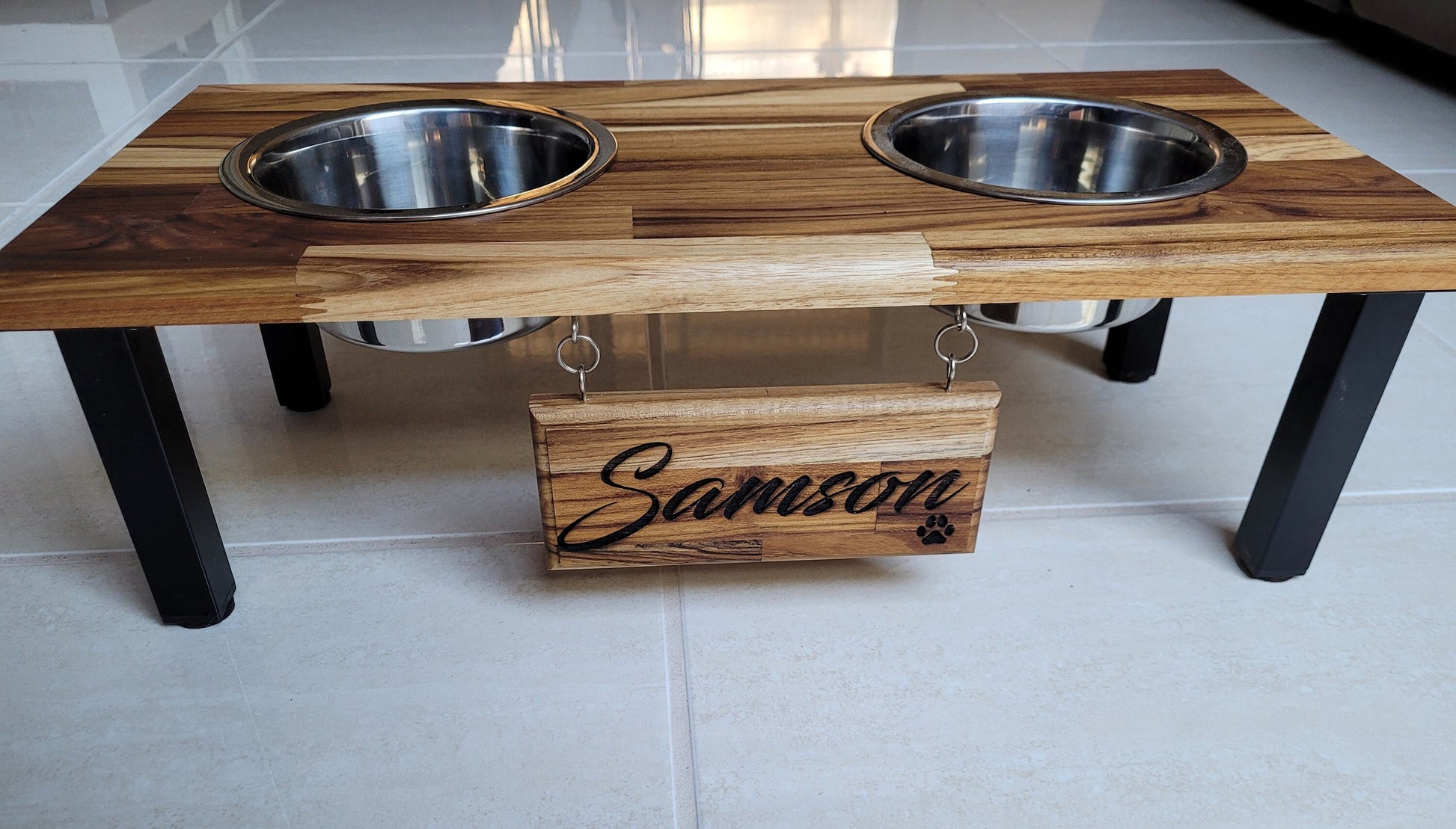 Made with a beautiful TEAK Wood, hand sanded to a smooth finish, the edges of the wood are machined on a router table with a sleek Finish. Then finally treated with a food safe mineral Oil, the legs have a rubber foot so it wont move while your pet eats